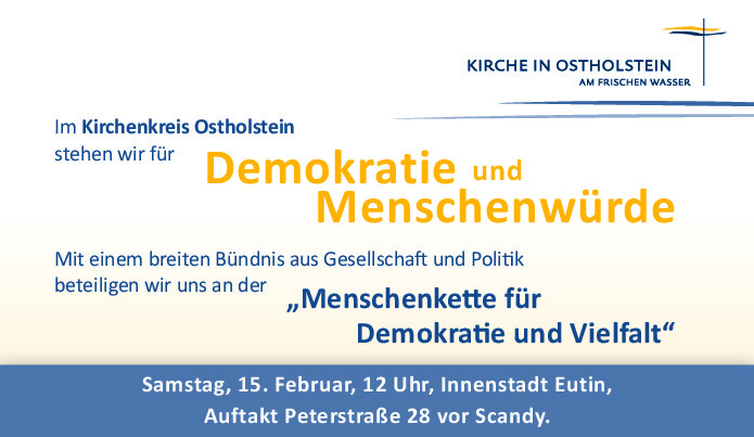 Wir fordern dazu auf, sich an der von einem breiten Bündnis aus Gesellschaft und Politik organisierten Menschenkette, um 12 Uhr, in der Eutiner Innenstadt zu beteiligen, die dort am 15. Februar unter dem Motto „Eutin ist bunt, Ostholstein ist bunt“ für Demokratie und Vielfalt gebildet werden soll. Als Kirchenkreis stehen wir für Demokratie und Menschenrechte und für Vielfalt. Das ist unsere Motivation zur Teilnahme.
